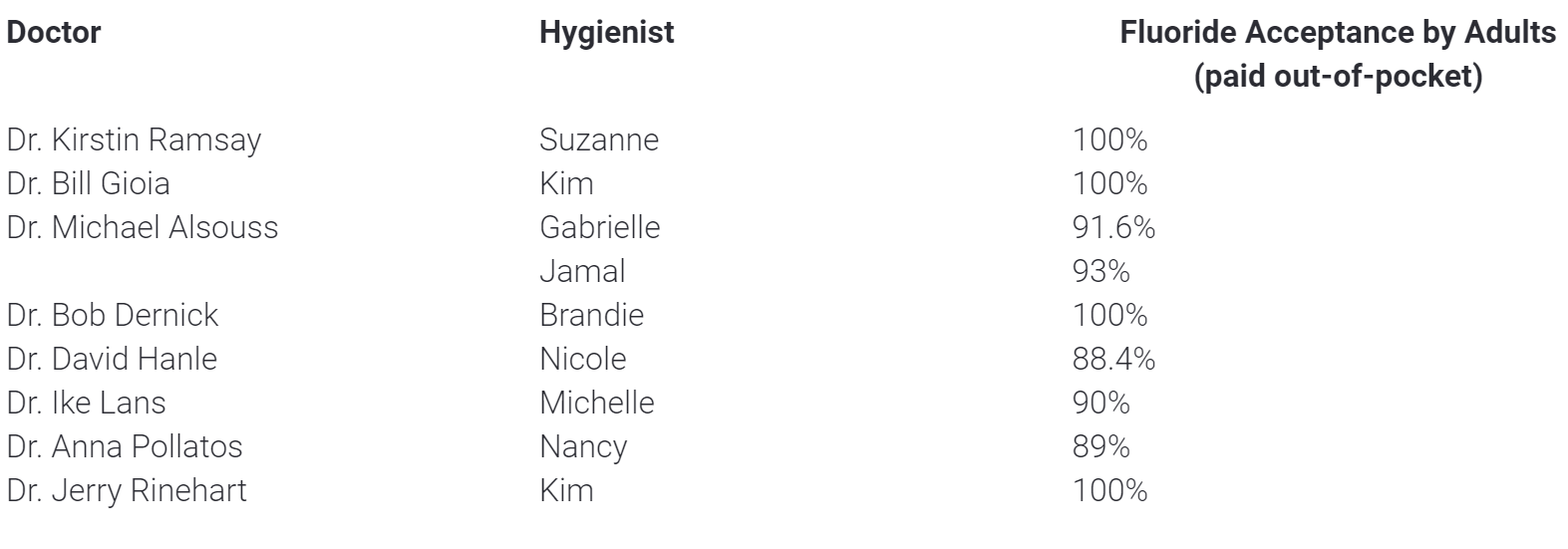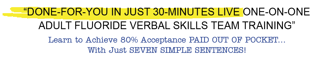The reason most of our colleagues no longer offer Fluoride to adults is the inevitable response... “Does my insurance cover that?” During your team training call you will learn how, in just seven sentences, to 100% guaranteed eliminate ever hearing that question again... and, achieve 80% (or better) acceptance of Fluoride by adults, who will gladly pay for the treatment out of pocket.